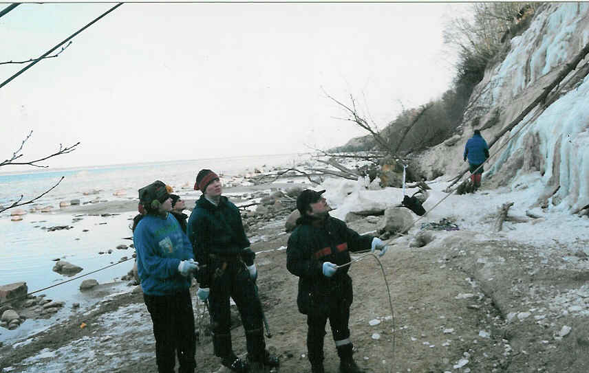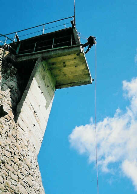 KÖIEGA LASKUMINE Mis laskumisse puutub, on asi palju lihtsam. On vaja lihtsalt kõrget objekti. Hästi sobivad näit Tallinna suusahüppetornid. Kuutsemäel on vaateplatvormiga mobiilimast, see on hea koht. Tartus Püssirohukeldri sein on päris mõnus, aga korra on viinud Tartu politsei mind sealt minema. Mind süüdistati avaliku korra rikkumises. Tegelikult sobivad kõik tornid, majad, korstnad jms ehitised. Eluliselt vajalik on ainult see, et köie ja julgestusköie kinnitamise kohad oleksid kindlad. Kõrgeim koht, kust mina köiega alla olen tulnud, on Aegviidus asuv vana Nõukogude sõjaväe raadiomast. Sellel on kõrgust 70 meetrit ja tõtt-öelda enne üle ääre astumist on rinnus ikka tõeliselt vastik tunne. Perspektiiv sarnaneb vaatega lennukist, sest torn on kolm korda kõrgem, kui teda ümbritsevad puud.